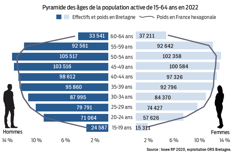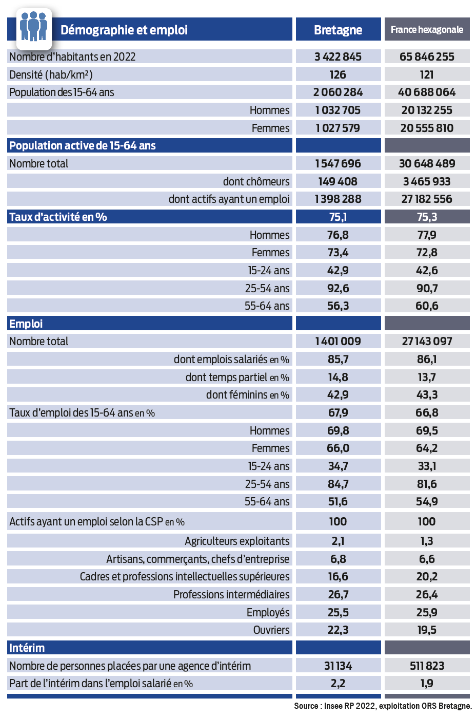 En 2022, selon les données du recensement de la population de l’Insee, la Bretagne compte plus de 1,5 million d’actifs âgés de 15 à 64 ans (actifs ayant un emploi et chômeurs), soit 75,1 % de la population des 15-64 ans, proportion proche de celle observée en France (75,3 %). Toutefois, l’accroissement du taux d’activité entre 2016 et 2022, a été plus marqué en Bretagne (+ 1,8 %) qu’en France hexagonale (+ 1,3 %).