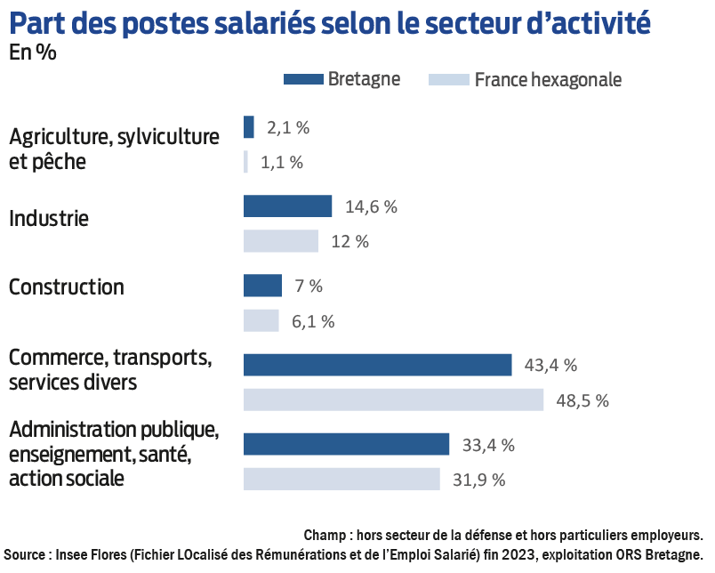 La Bretagne compte un peu plus d’emplois salariés que la France hexagonale dans l’agriculture, l’industrie et l’administration publique, enseignement, santé et action sociale. À l’inverse, le secteur du commerce, transport et services divers en compte un peu moins.