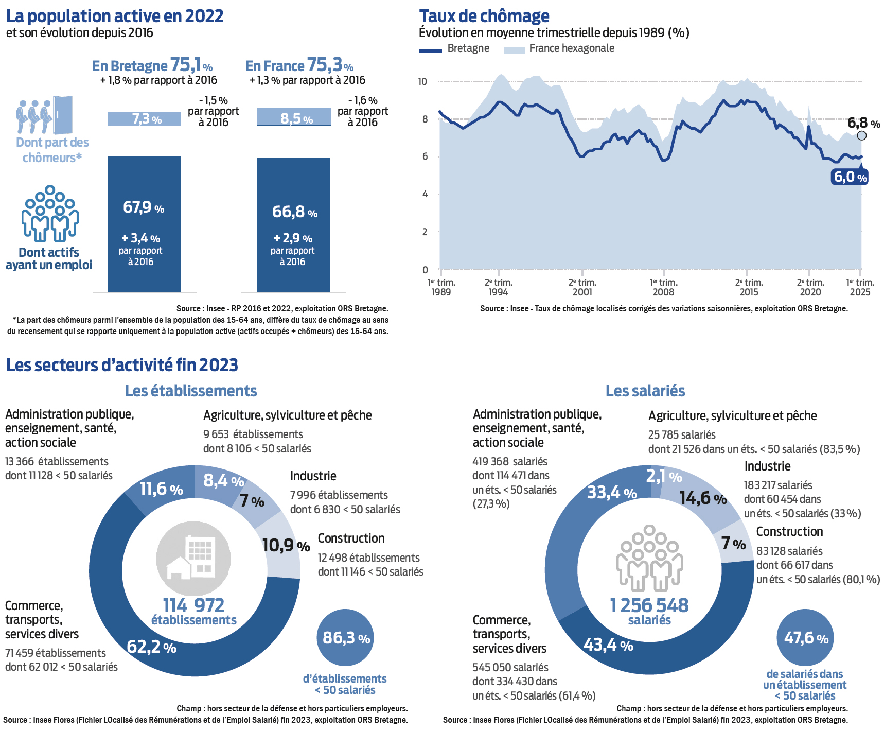 En 2022, selon les données du recensement de la population de l’Insee, la Bretagne compte plus de 1,5 million d’actifs âgés de 15 à 64 ans (actifs ayant un emploi et chômeurs), soit 75,1 % de la population des 15-64 ans, proportion proche de celle observée en France (75,3 %). Toutefois, l’accroissement du taux d’activité entre 2016 et 2022, a été plus marqué en Bretagne (+ 1,8 %) qu’en France hexagonale (+ 1,3 %).