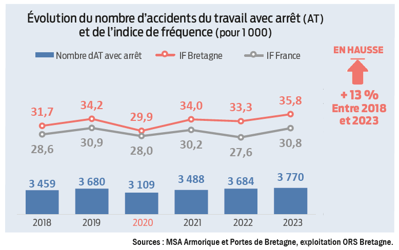 Avec 3 770 accidents du travail avec arrêt (AT) en 2023, la Bretagne présente un indice de fréquence (IF) égal à 35,8 accidents du travail avec arrêt pour 1 000 salariés agricoles.