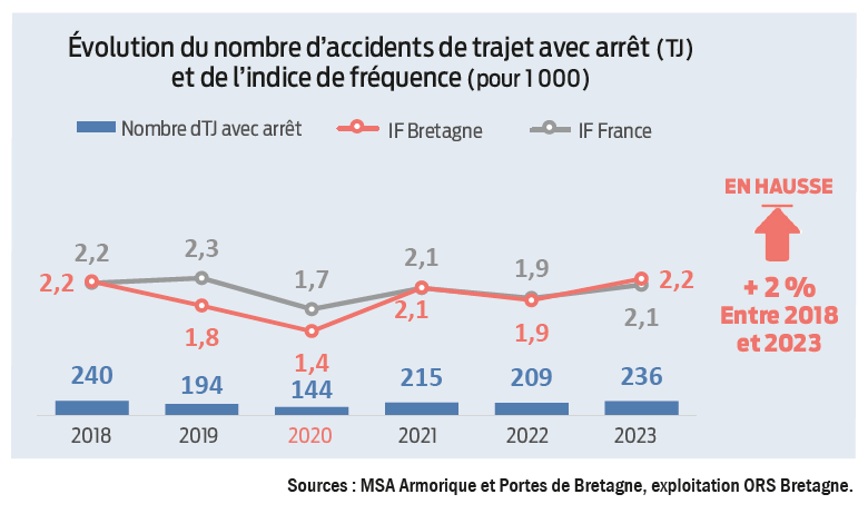 Avec 236 accidents de trajet avec arrêt (TJ) en 2023, la Bretagne affiche un indice de fréquence (IF) de 2,2 accidents de trajet avec arrêt pour 1 000 salariés agricoles comme en France.