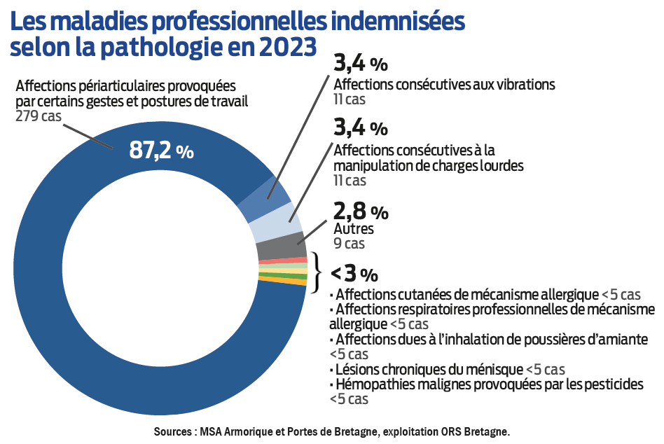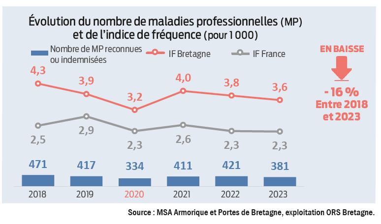 Avec 381 maladies professionnelles (MP) reconnues ou indemnisées en 2023, la Bretagne présente un indice de fréquence (IF) de 3,6 maladies professionnelles pour 1 000 salariés agricoles.