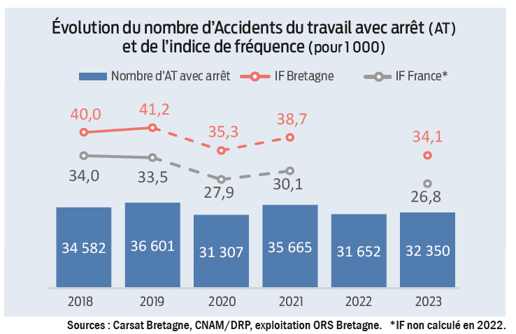 En 2023, 32 350 accidents du travail avec arrêt (AT) ont été recensés en Bretagne chez les salariés bretons du régime général, soit un nombre en hausse par rapport à l’année précédente mais qui reste inférieur au volume atteint avant 2020.