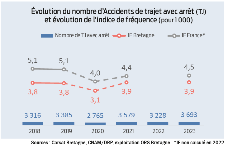 Avec 3 693 accidents de trajet (TJ) en 2023, la Bretagne affiche une hausse du nombre d’accidents de trajet avec arrêt de +465 TJ chez les salariés bretons du régime général par rapport à l’année précédente.