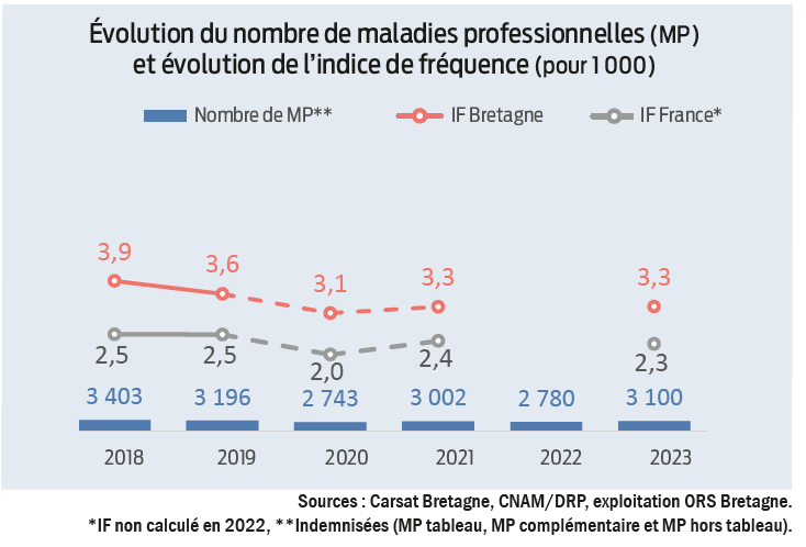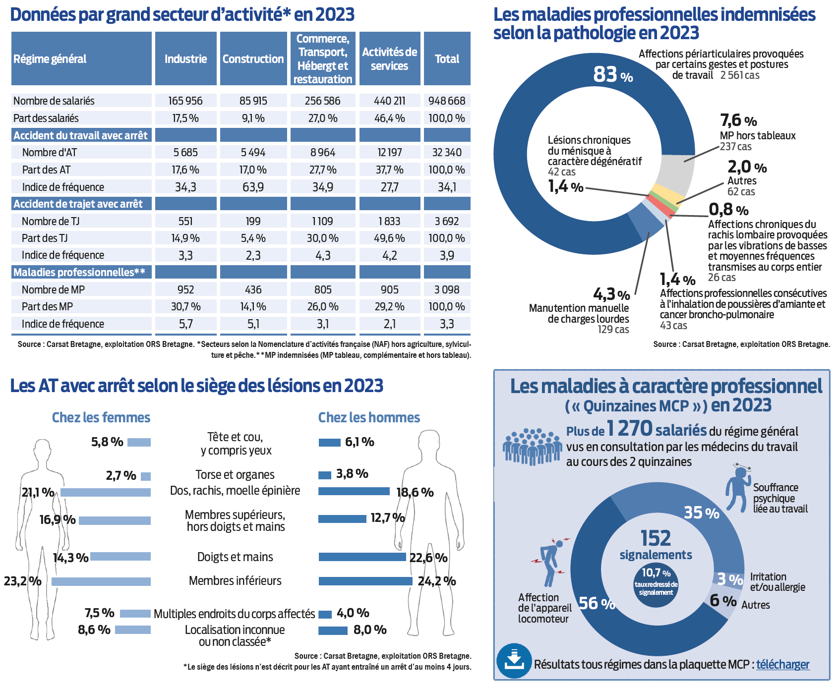 Au total, 3 100 maladies professionnelles (MP) ont été dénombrées en 2023 dans la région, soit une augmentation de + 320 du nombre de MP chez les salariés bretons du régime général par rapport à l’année précédente.