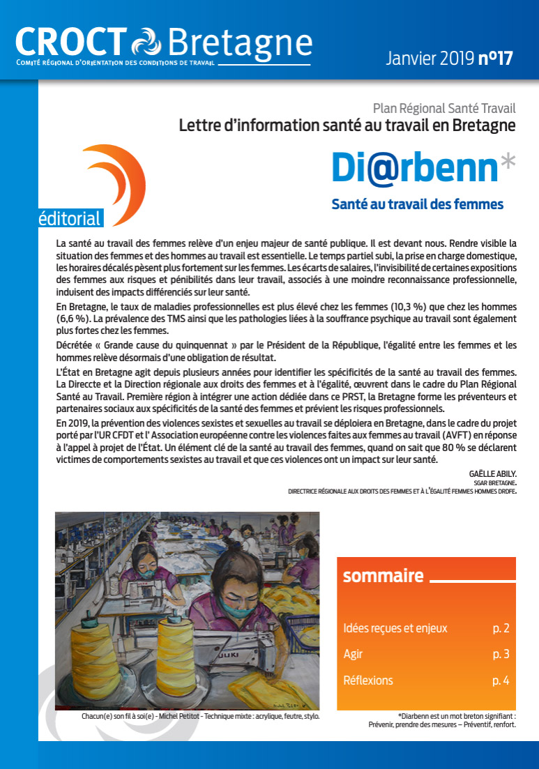 Retrouvez le numéro spécial de la lettre Di@rbenn consacré à la santé au travail des femmes : statistiques régionales, déconstruction des idées reçues, enjeu d’égalité F/H en matière de santé, violences sexistes et sexuelles au travail… Bonne lecture !